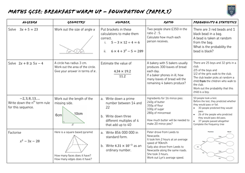 2019 Aqa Gcse Maths Exam Breakfast Revision Sheets Paper 1 Teaching Resources