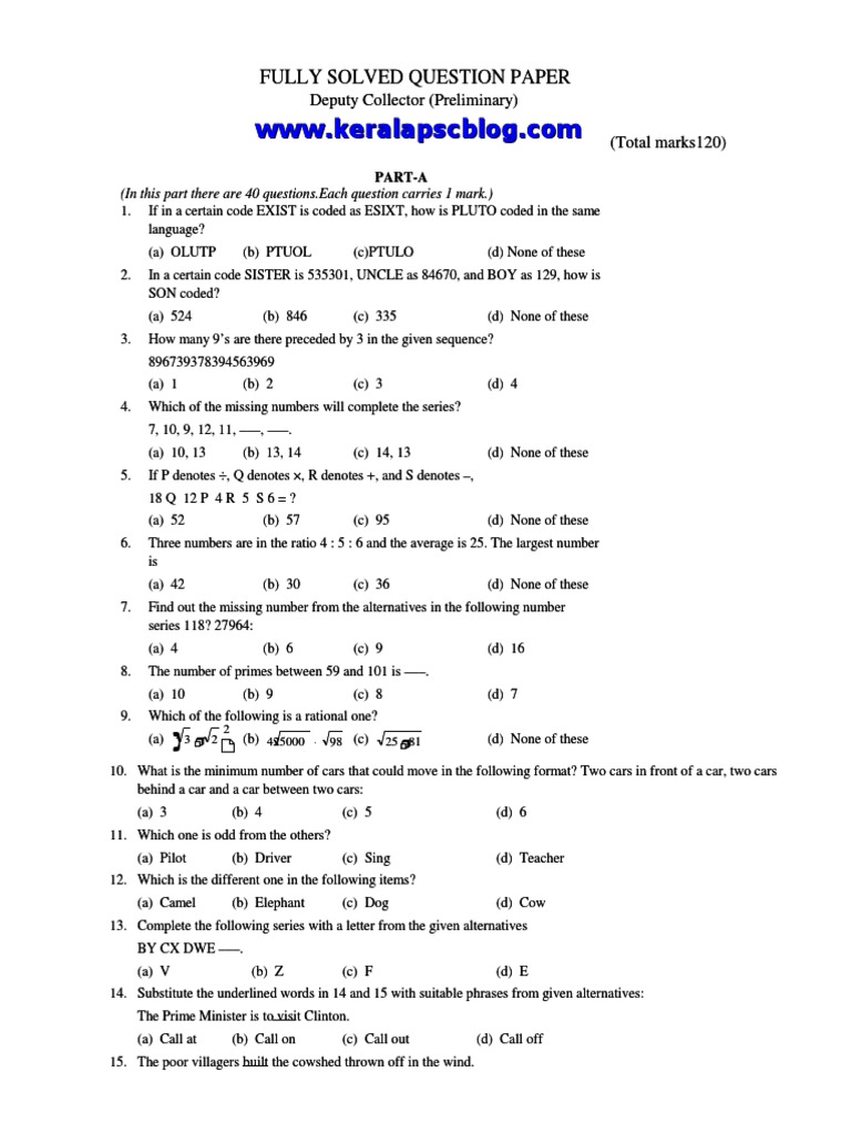 Kerala Psc Deputy Collector Preliminary Question Paper Nature